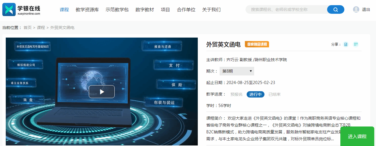 必赢官网商学院齐巧云老师主持的《外贸英文函电》课程获评2023年职业教育国家在线精品课程,这是必赢官网首门获评的国家级精品课程,填补必赢官网在国家级精品课程上的空白,为必赢官网双高建设做出突出贡献。这一成果不仅是必赢官网在教学改革和课程建设上的重要突破,更有效提升了课程的推广度和影响力,进一步推动了学校的课程创新与教学质量提升。