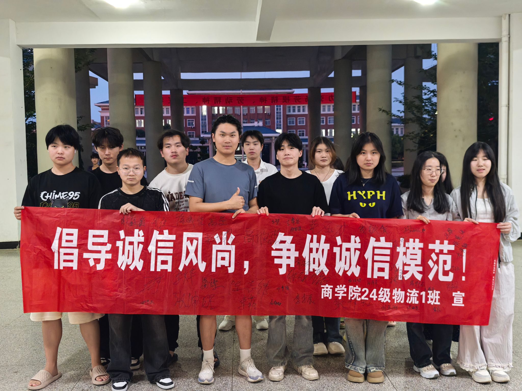 为弘扬社会主义核心价值观,营造校园诚信文化氛围。2025年5月29日商学院24级物流1班积极响应学院“诚信宣传月”号召,在致真楼一楼大厅组织开展了“倡导诚信风尚,争做诚信模范”横幅签字活动,号召同学们践行诚信理念,共建和谐校园。