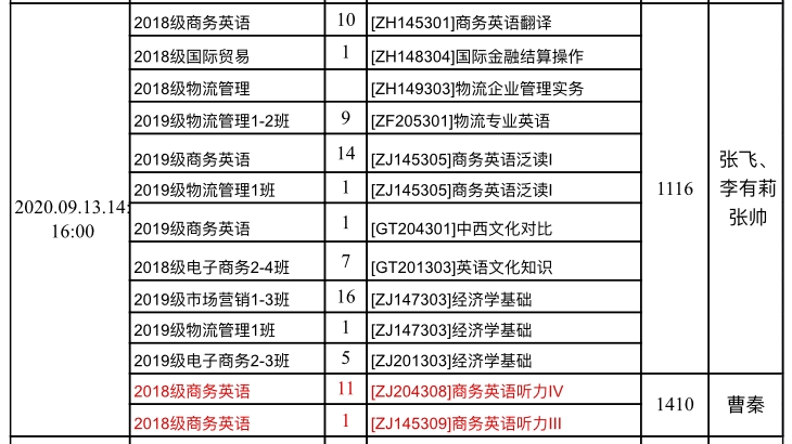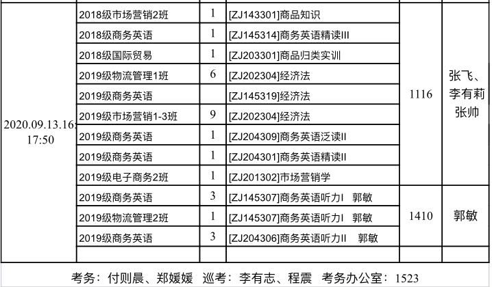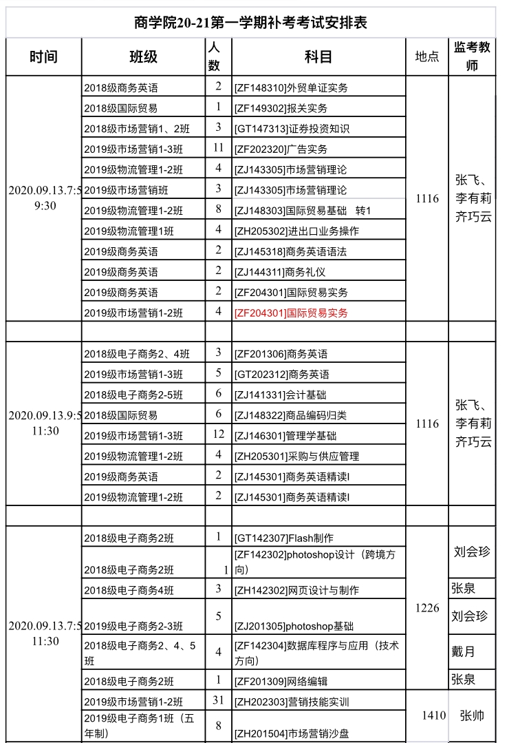2020-2021学年第一学期补考考试安排表