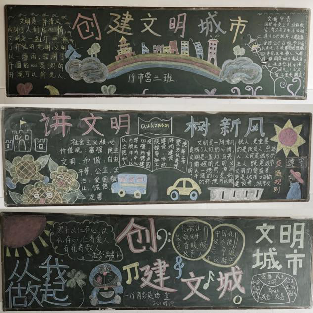 活动开展以来,各班级以“创文明城市,建和谐校园”为主题对板报进行了精心的设计,板面内容大方得体,丰富多彩。充分地诠释了同学们对创建文明城市的理解与期望,富有良好的教育意义。同时加大了创建文明城市的宣传力度,给予学生良好文明礼仪的熏陶,让学生真正从思想上响应创建,行动上参与创建。经过学生会成员们的认真评选,19物流2班最终拔得头筹,荣获一等奖;19商务英语班和19市营2班荣获二等奖,19市营1班、19市营3班和19电商3班荣获三等奖。