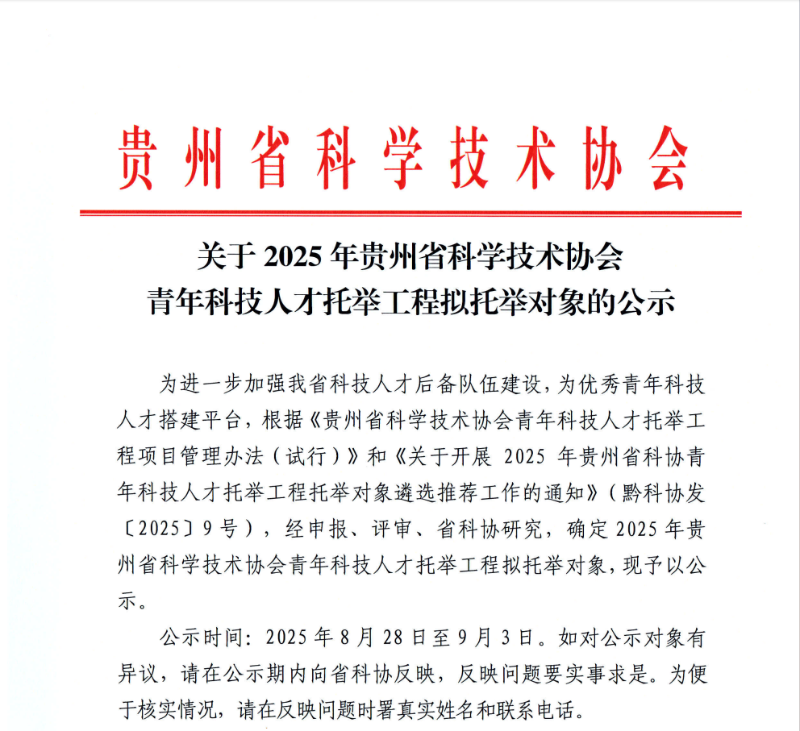 近日,贵州省科学技术协会公示了2025年贵州省青年科技人才托举工程拟托举对象名单,Beat365资源与环境学院刘亚曦博士成功入选。