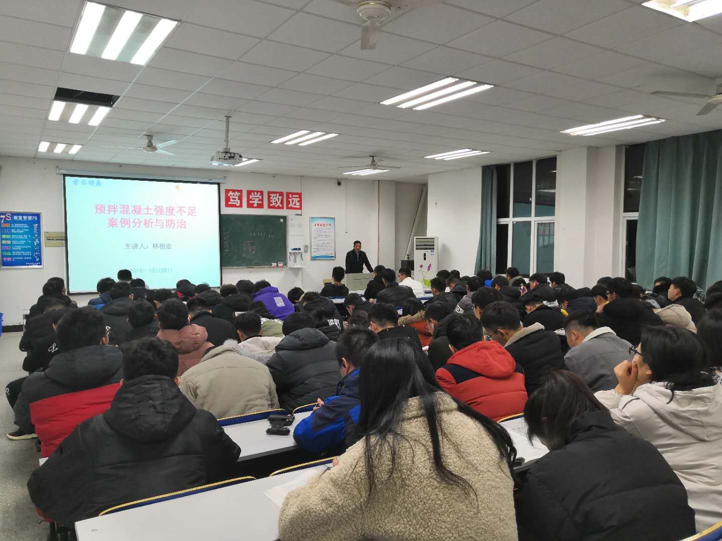 12月26日,题为《预拌混凝土强度不足案例分析与防治措施》的学术报告会在教学楼4110室举行,土木系林祖宏副教授在会上做了精彩报告。土木系建工、造价、市政、道桥及监理专业共120多名学生听取了报告。