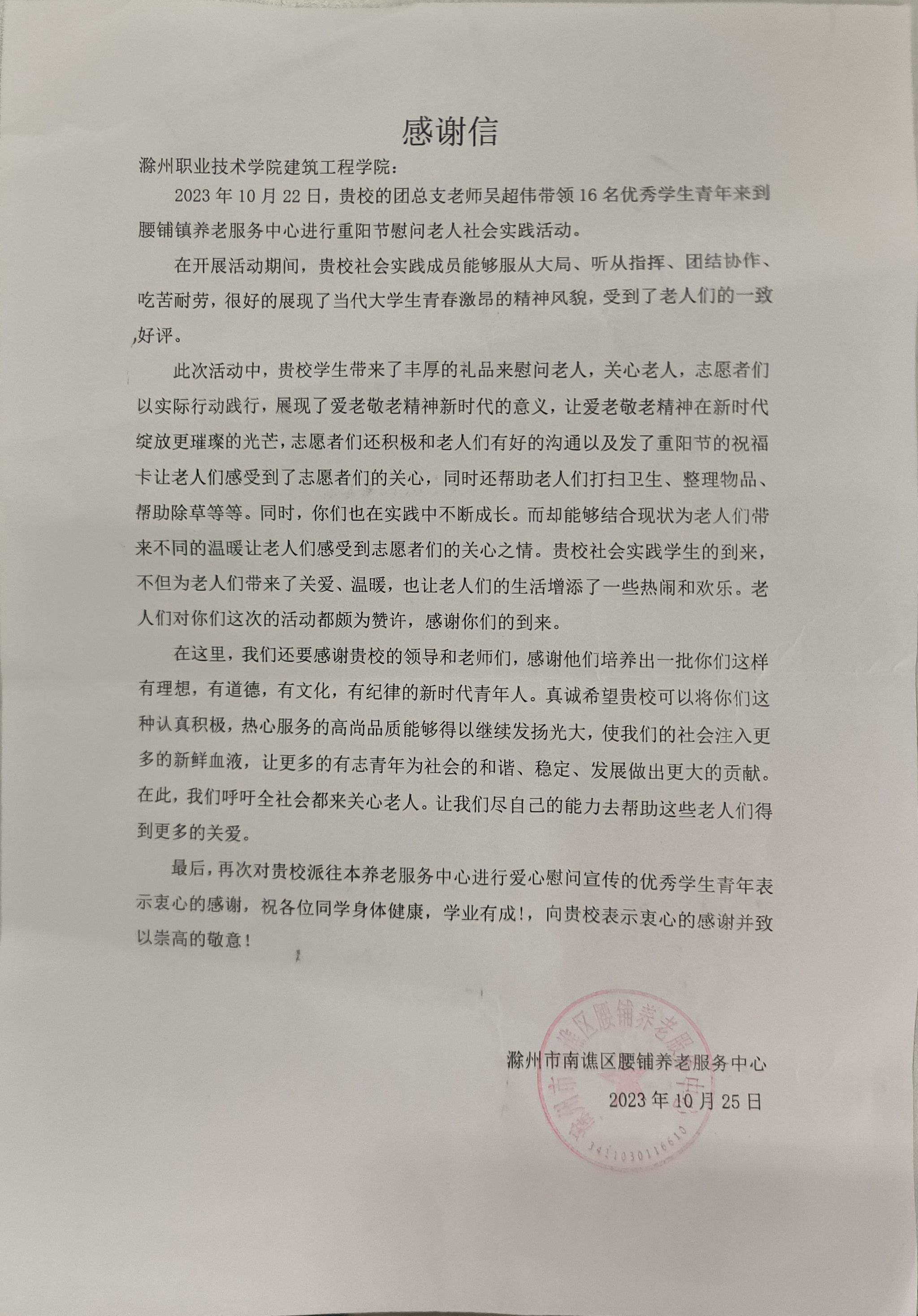 近日,滁州市南谁区腰铺养老服务中心向必赢官网建筑工程学院致感谢信,对必赢官网建筑工程学院表示衷心的感谢并致以崇高的敬意。