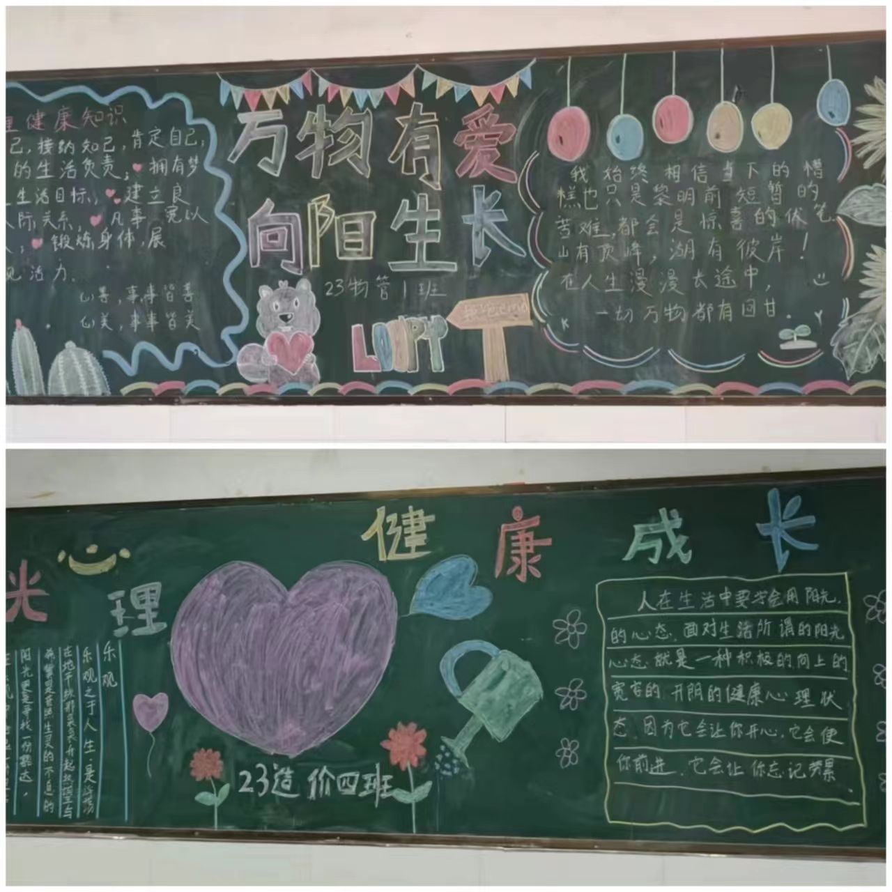 组织各班绘制心理健康主题黑板报展示并张贴心理健康海报。通过设计制作黑板报和阅读海报,深入了解心理健康知识,增强心理健康意识,引导同学们树立正确的人生观、价值观,积极营造有利于学生身心健康和谐发展的校园氛围。