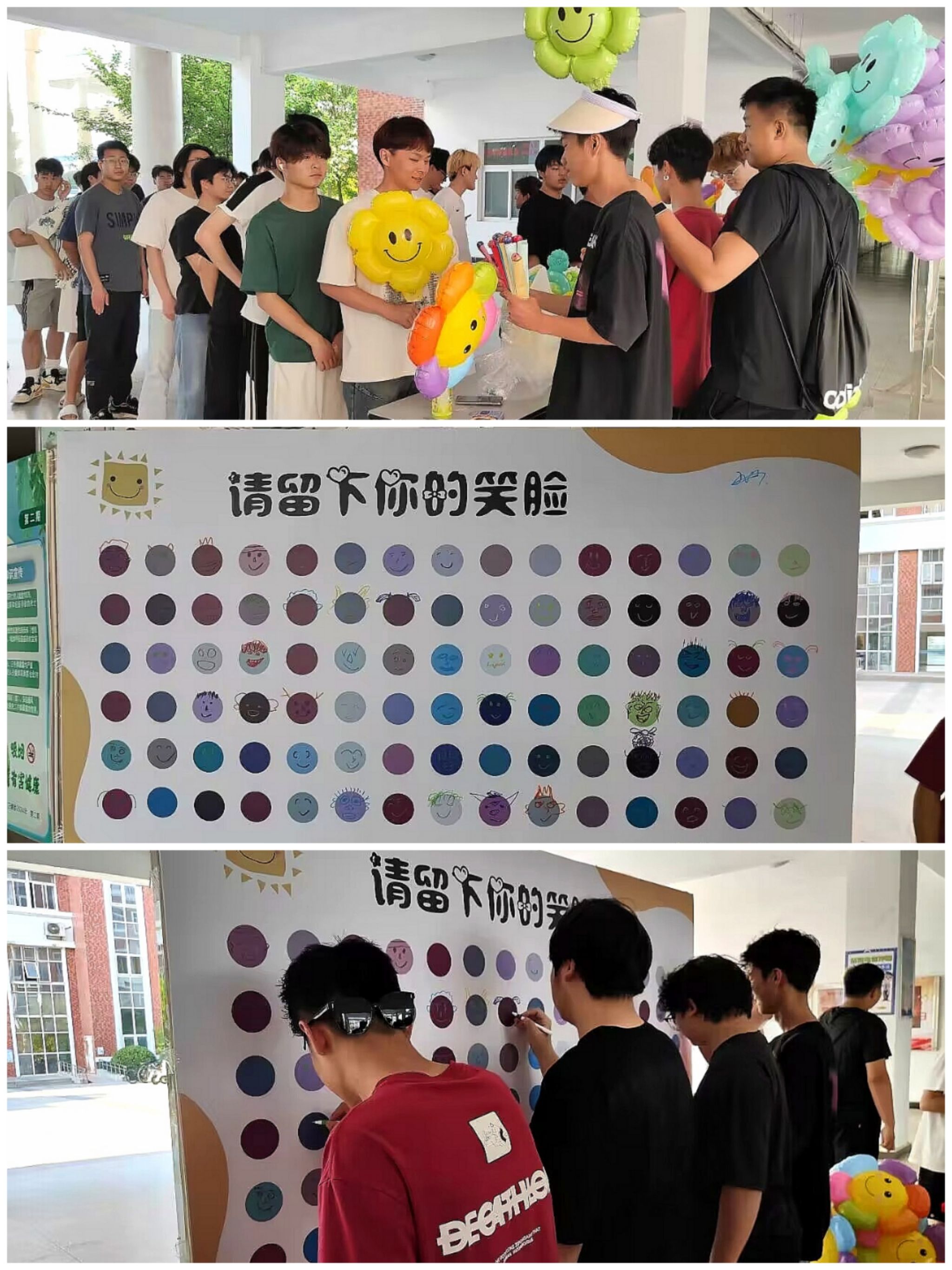 多元化开展学生心理健康教育工作,学院组织开展“请画出你的笑脸”心理健康主题活动。同学们选择自己喜欢的颜色蜡笔在展板上画出笑脸,有的用鲜艳的色彩填充笑脸,有的则在笑脸中加入了各种图案,每一张笑脸都独一无二,每个笑脸都具有独特寓意,都是最真实,最美好的情感寄托。笑脸并不是仅仅的一幅画,更是爱的传递。
