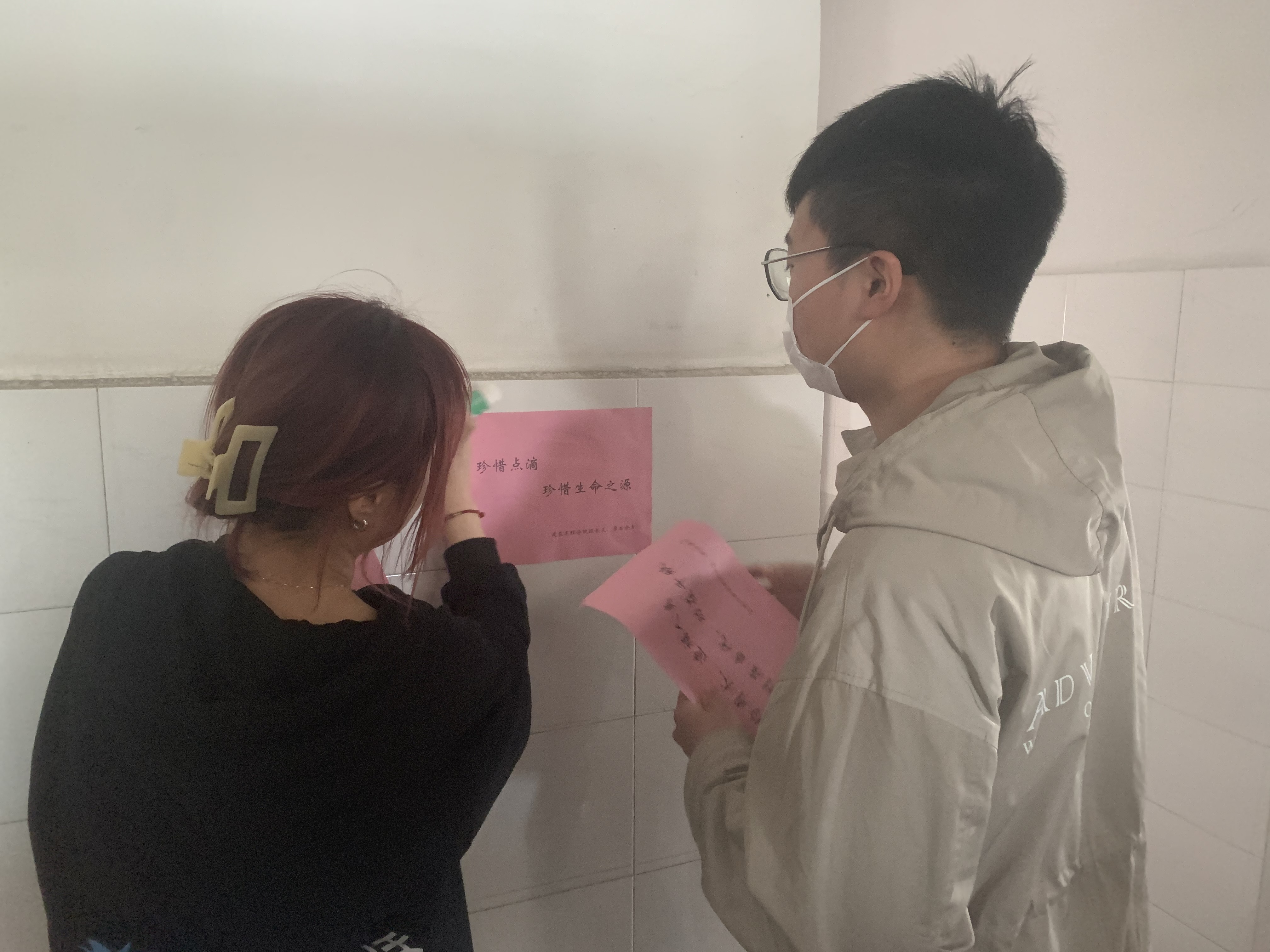 “向阳花”志愿者们在致学楼、宿舍等区域检查用水设施是否漏水,并张贴节约用水标语,旨在引导同学们养成节水,爱水,惜水的传统美德。