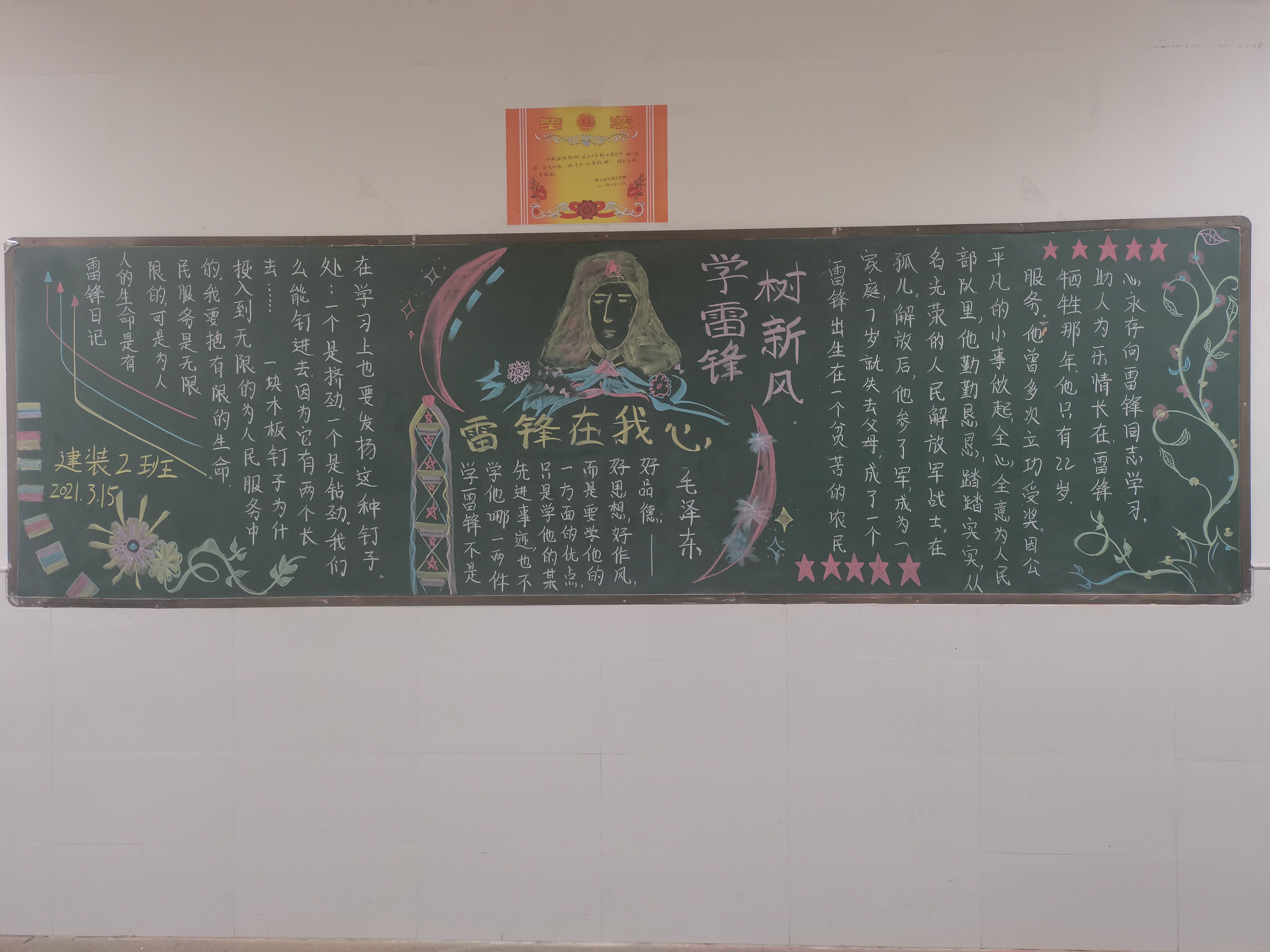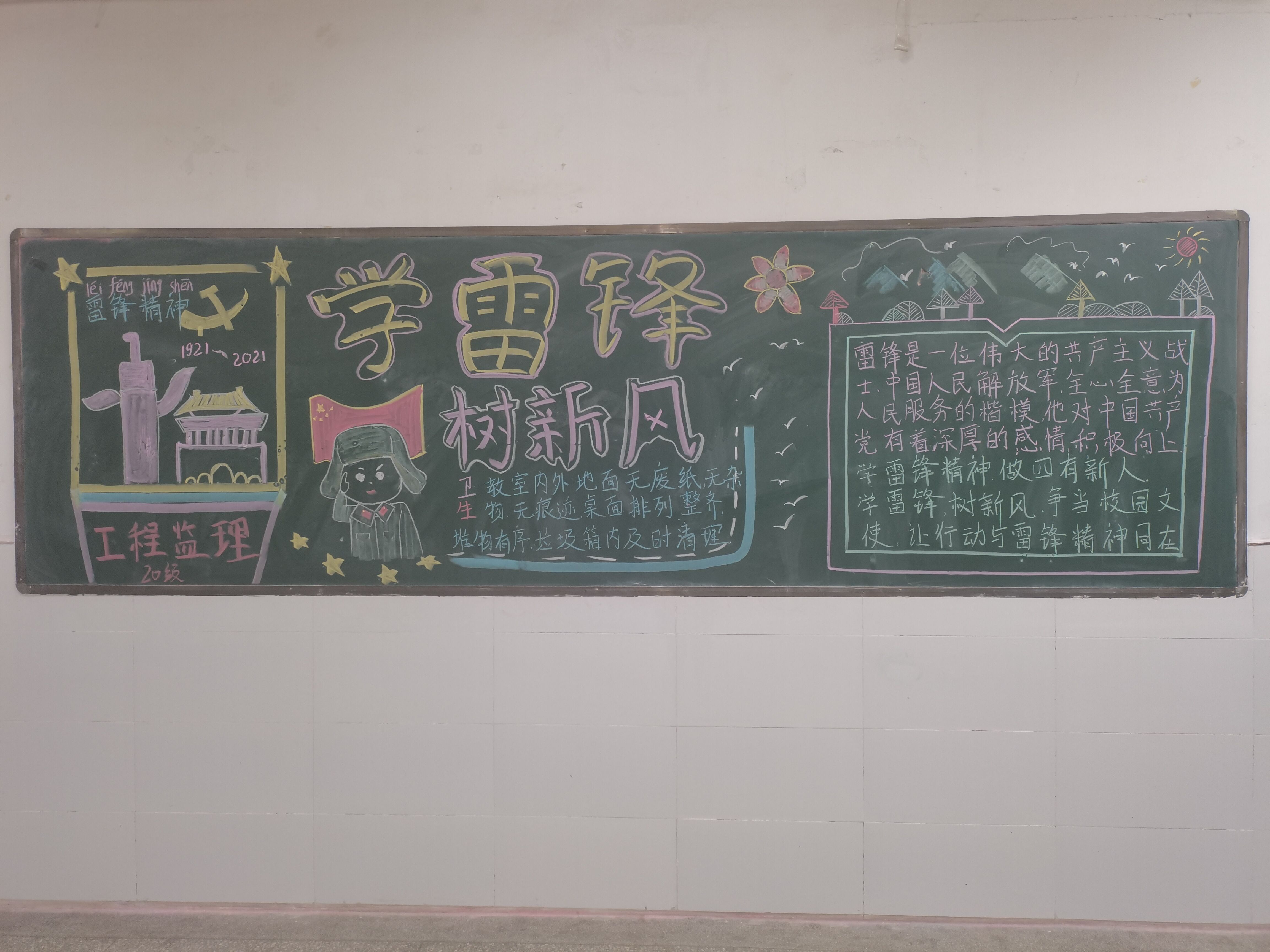 本次参赛的各黑板报主题突出,内容丰富,布局美观,有的班级是向雷锋同志学习,有的是介绍了雷锋同志的故事。学院本着公平公正的原则与创新立意的理念,根据主题、排版、内容、色彩等几个方面对各班级黑板报进行了评分。最终,2020级建装2班荣获一等奖,此外二等奖班级2名,三等奖班级3名。