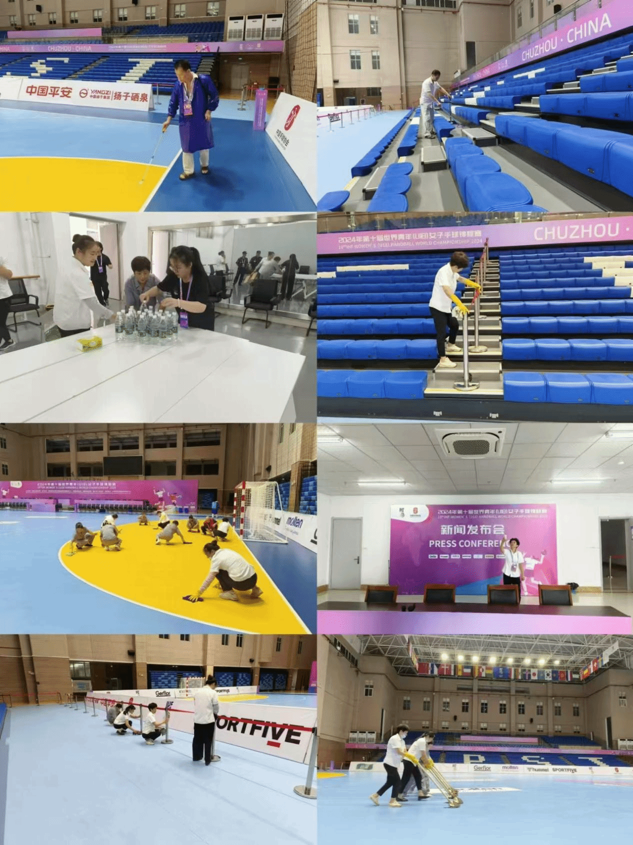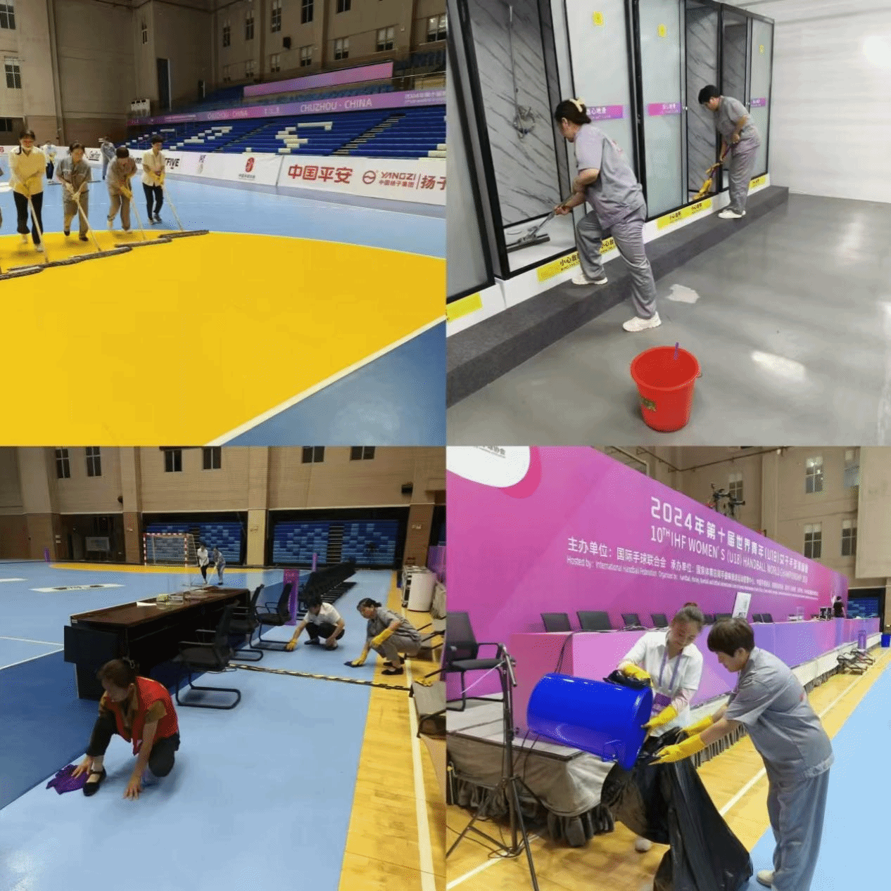 比赛期间,实行定人、定岗、定位,后勤服务人员始终坚守各自岗位,不辞辛劳、周到服务,并对场馆的公共区域进行高频次的日常维护保养,确保运动员和观众比赛舒适、观球舒心,高标准做好赛场的各项维护清洁工作。