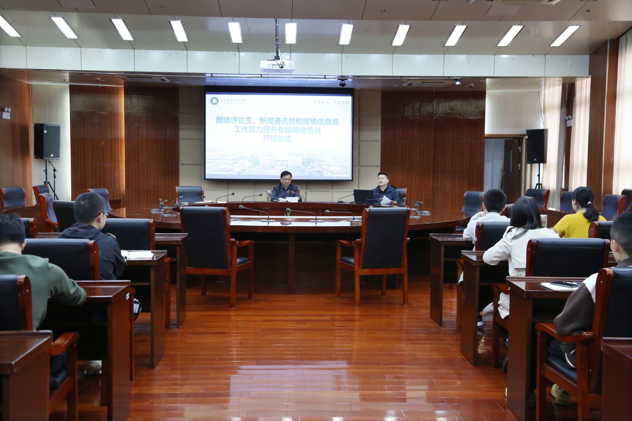 为贯彻落实学校2024年党政工作要点任务,通过开展大学习、大培训进一步加强新闻通讯员队伍建设,提高新闻通讯员的政治觉悟和政治敏感性,加强和改进新形势下学校新闻宣传工作,切实培养一支素质高、能力强的新闻通讯员队伍,更好地服务学校“双高校”建设。学校于4月17日下午,在综合楼11楼会议室召开新闻通讯员工作能力提升专题网络培训开班仪式。校党委委员、宣传统战部部长王冬出席开班式,各教学院部、各部门通讯员,宣传统战部有关工作人员参加了开班仪式。开班仪式由王冬主持。