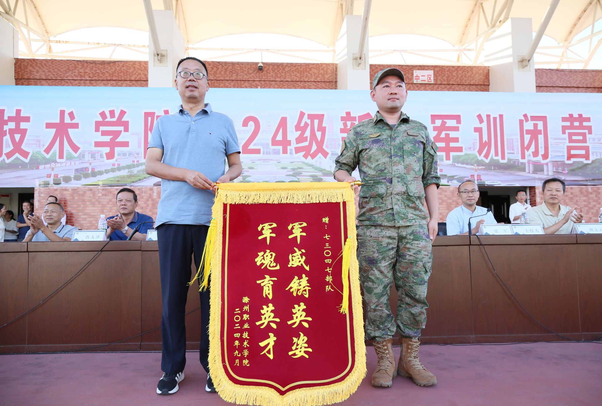 李平权代表学校向承训单位赠送“军威铸英姿,军魂育英才”锦旗,并宣布“必赢76net线路官网2024级新生军训闭营”。