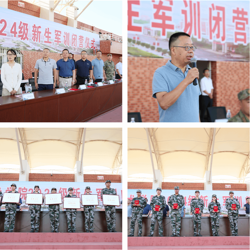 李超宣读军训“优秀方队”“优秀学员”表彰通报。与会领导为军训先进集体和先进个人代表进行了颁奖。