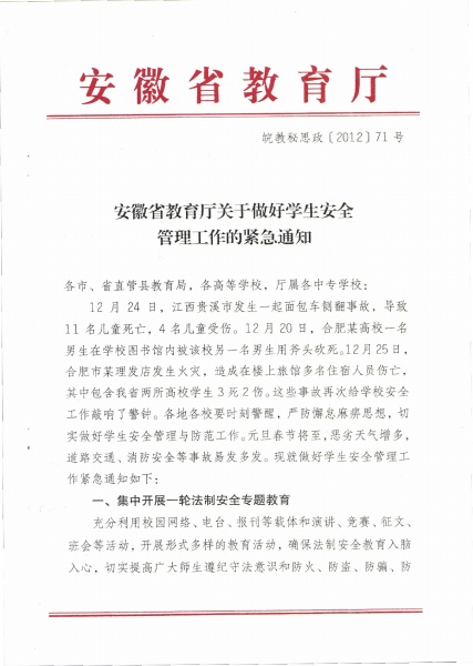 转发省教育厅关于做好学生安全管理工作的紧急通知