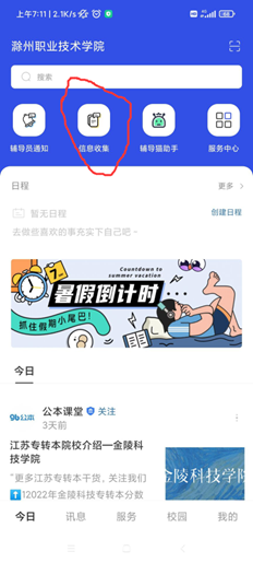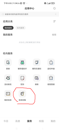 在“讯息”中接收通知,及时点击进入“信息收集”,在规定的时间范围内完成信息的填写。注意按照填写格式要求填写,否则辅导员老师会要求打回重填哦,或是在“服务”点击信息收集。