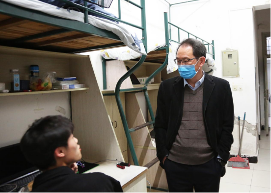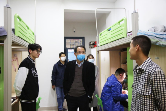 走访中,校领导们与值班辅导员亲切交谈,详细了解了疫情防控期间辅导员开展的学生思想教育、健康状况摸排、心理咨询辅导等工作情况。曹付忠强调,要继续深入加强对学生的教育和引导,进一步密切师生关系,对重点关注学生要加强与学生本人及家长的沟通,适时做好心理疏导,耐心安抚学生情绪,帮助学生解决实际困难。各学院在遵守疫情防控要求的前提下多开展丰富多彩的文体活动,充实同学们的校园生活,让学生用积极乐观的心情面对校内生活。要深入学生宿舍进行安全检查,及时排除安全隐患,确保学生人身安全。要畅通校内的各层级的咨询监督服务热线,主动、及时回应学生关切,继续坚持每日下沉督查,落实落细防控措施,筑牢疫情防控防线。许雪峰要求,要将走访中倾听到的学生的合理诉求反馈至相关部门予以解决,要强化人文关怀,做好疏导和答疑工作,及时解决同学们学习、生活等方面的困难,让学生感受到爱与温暖,同时要切实保障宿舍安全,确保学生安全稳定。