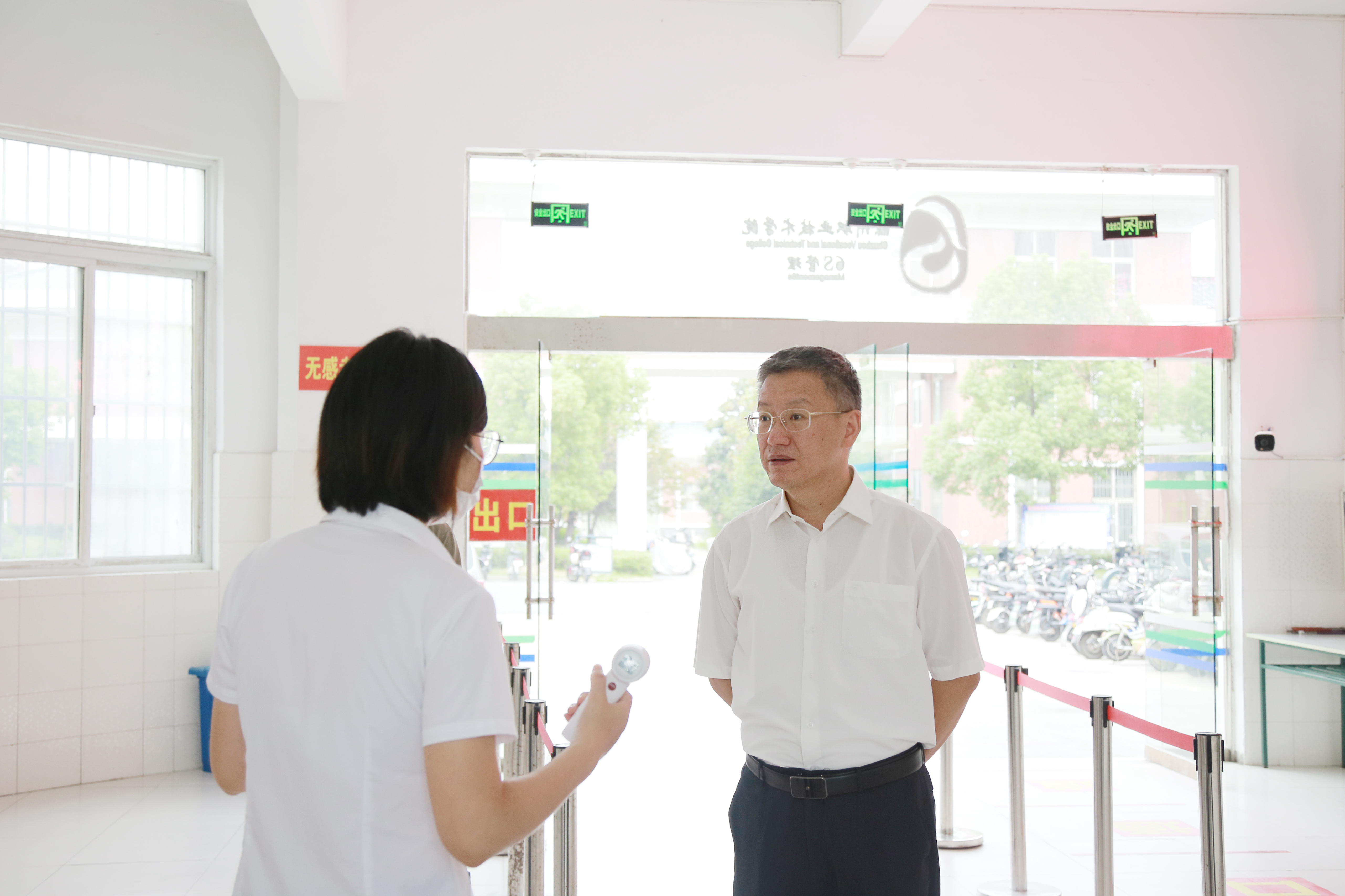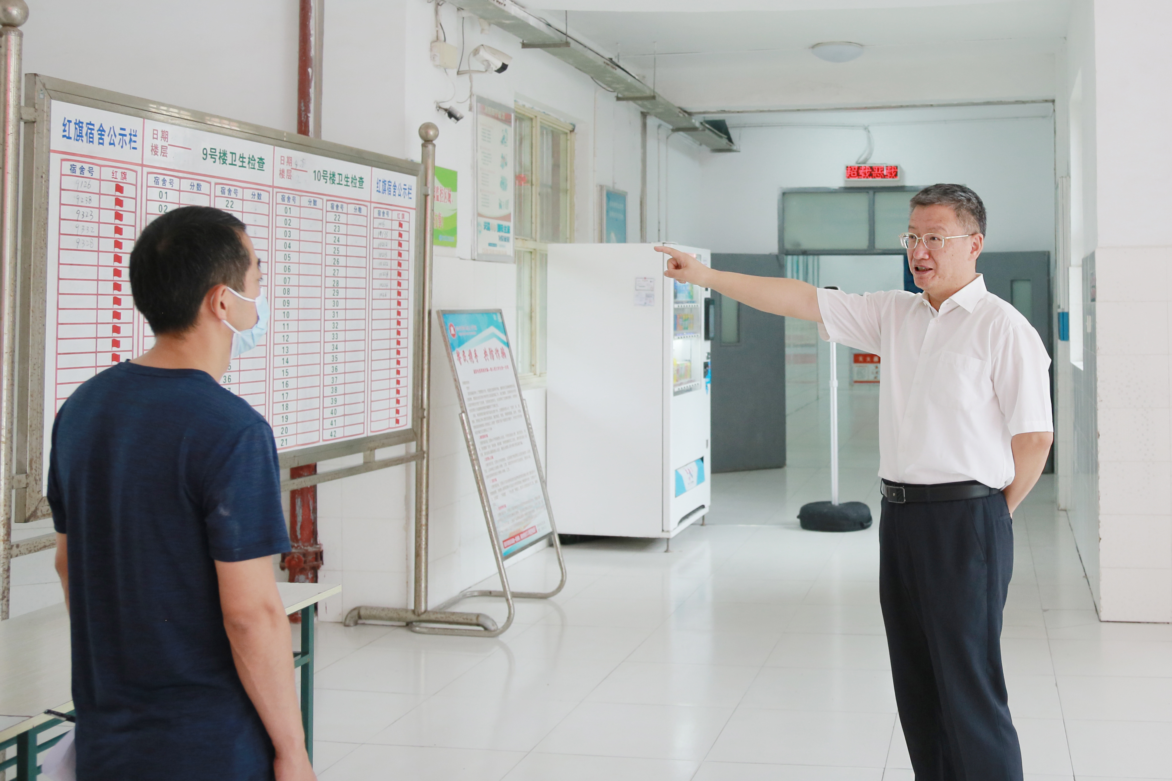 曹付忠一行实地查看了学生宿舍区体温检测设备运行情况,强调要做好宿舍通风和消毒工作,重点加强公共区域消杀,确保不留死角;要做好宣传教育,不断提升学生防疫意识。