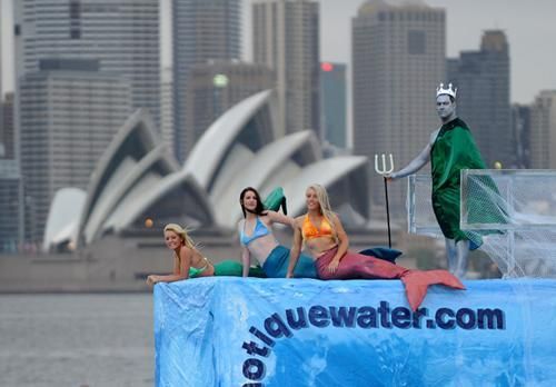 3月22日,海洋生物学家打扮成美人鱼和海神模样坐在6米长的“冰山”号船上经过澳大利亚悉尼港口大桥附近水面,以纪念世界水日。