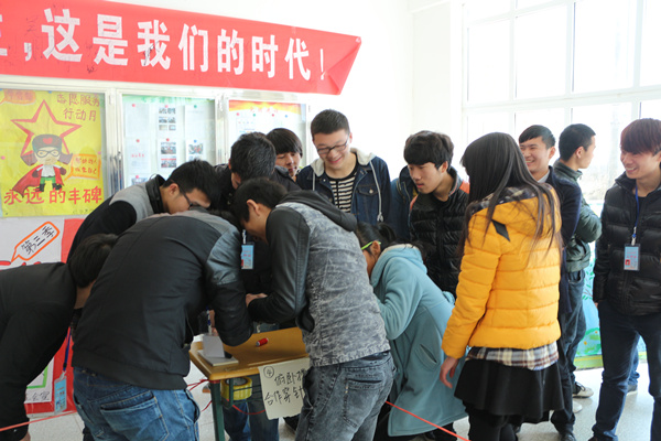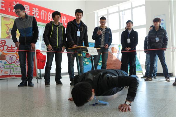 2014年3月14日中午,信息工程系的男生们聚集在一起参加了别开生面的男生节趣味活动。系学生会精心策划了包含绕口令、篮球保龄球、仰卧起坐、俯卧撑和穿针引线的活动流程,参赛队员必须一口气完成 ,一旦某个单项任务失败,必须重头开始。学干们给这项趣味活动起了一个贴切的名称叫“一气呵成”。紧张激烈的比赛始终伴随着欢声笑语,最终13物联网代表队拔得头筹取得冠军。