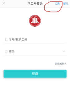 3.点击右上角的【切换】选择对应的学校名称,输入正确的账号/密码(未使用过今日校园的用户账号为身份证号,密码默认6个1),点击登录。首次登录会提示绑定手机号,根据提示输入手机号,接收短信验证码,即可完成登录。