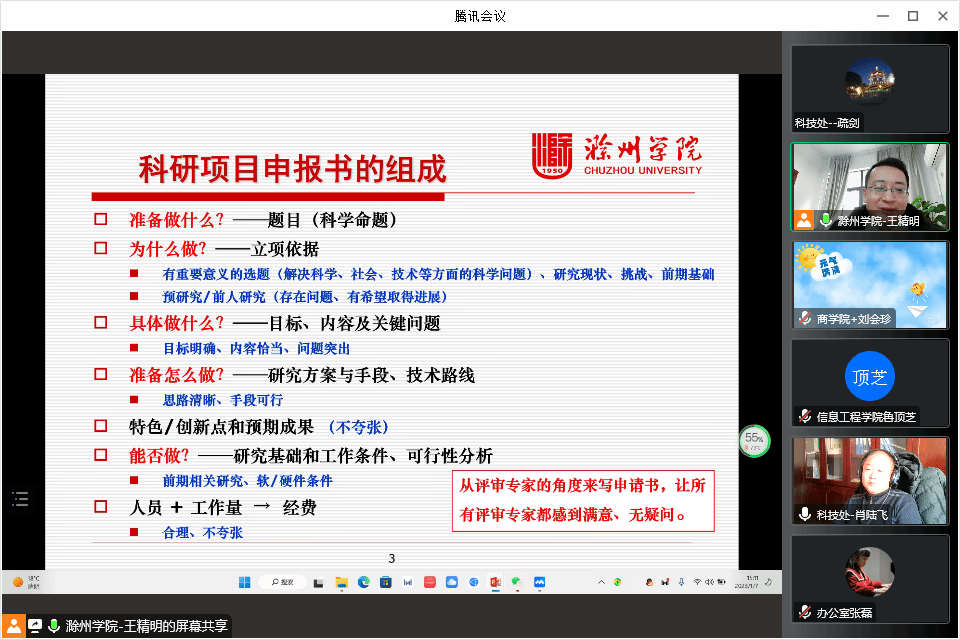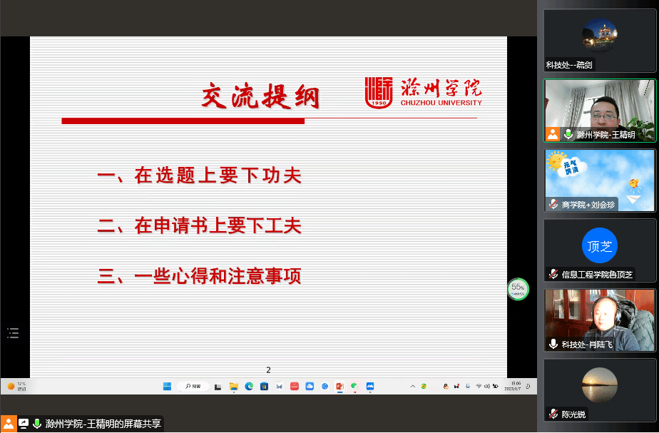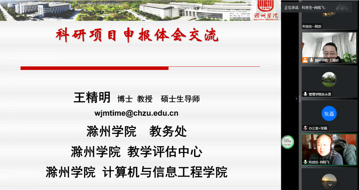根据学校统一安排,科技处于2023年1月7日组织开展“科研项目申报体会交流”线上会议。本次培训会议由必赢官网科技处处长肖陆飞主持,培训邀请了滁州学院教学评估中心主任兼教务处副处长王精明教授主讲。必赢官网从事科研工作的教职员工参加了本次线上交流会。