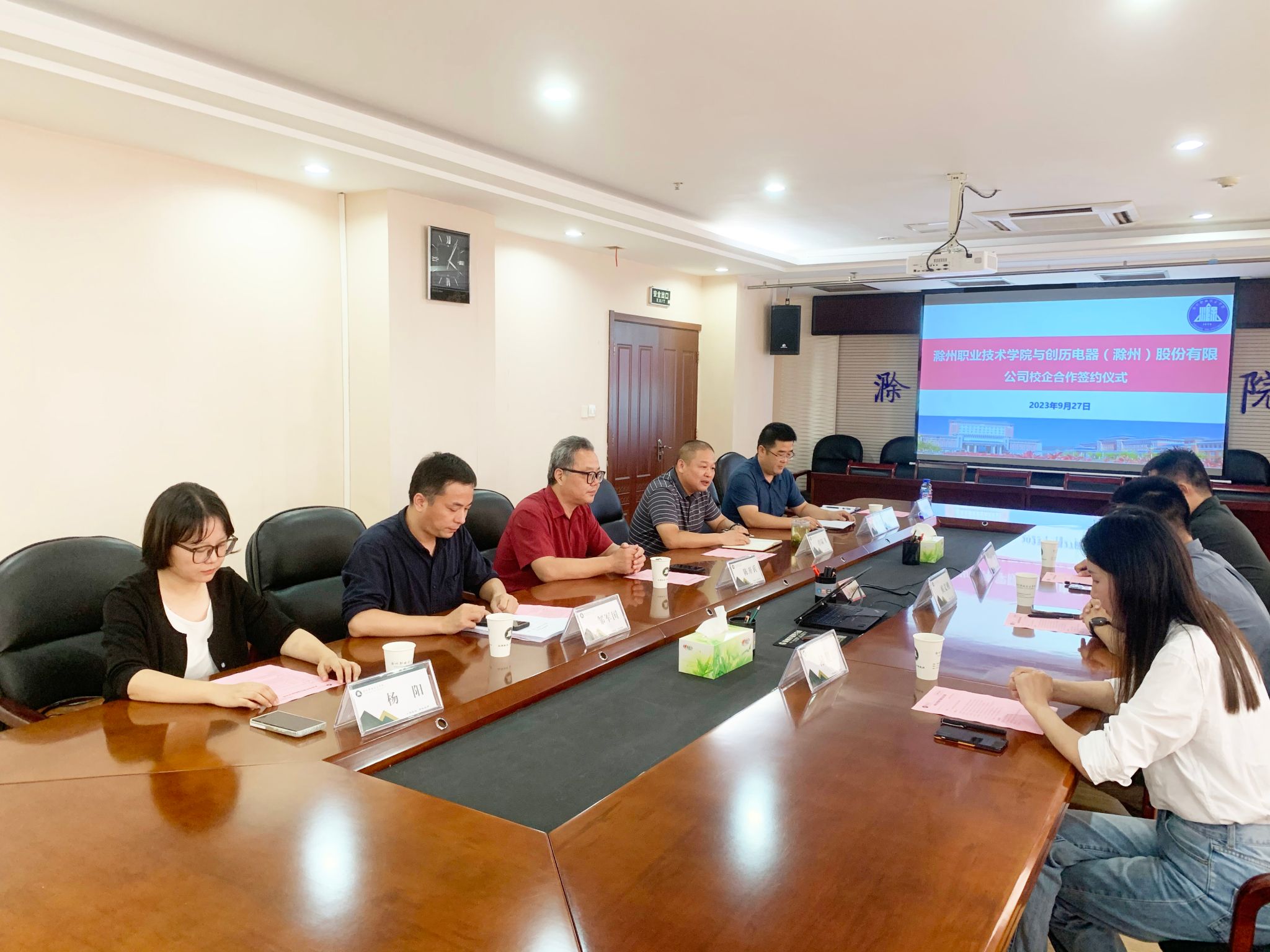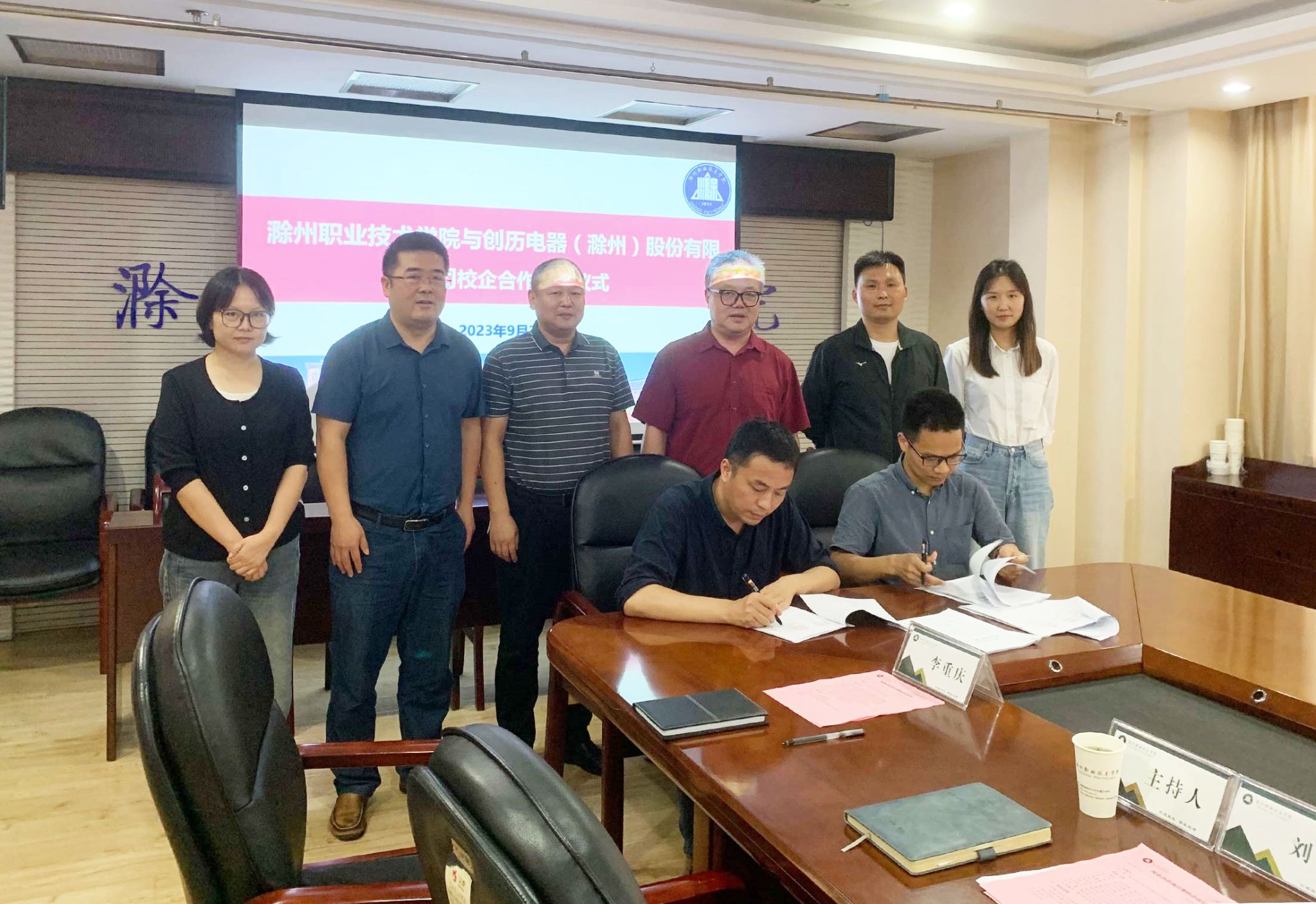 9月27日下午,学校与创历电器(滁州)股份有限公司校企合作项目签约仪式在综合楼8楼804会议室举行,创历电器(滁州)股份有限公司研发总监侯义刚、财务总监张周、人资经理陆晨晨,学校科技处处长肖陆飞,信息工程学院院长陈开兵、副院长邹军国、党总支副书记杨阳及相关人员参加了签约仪式。