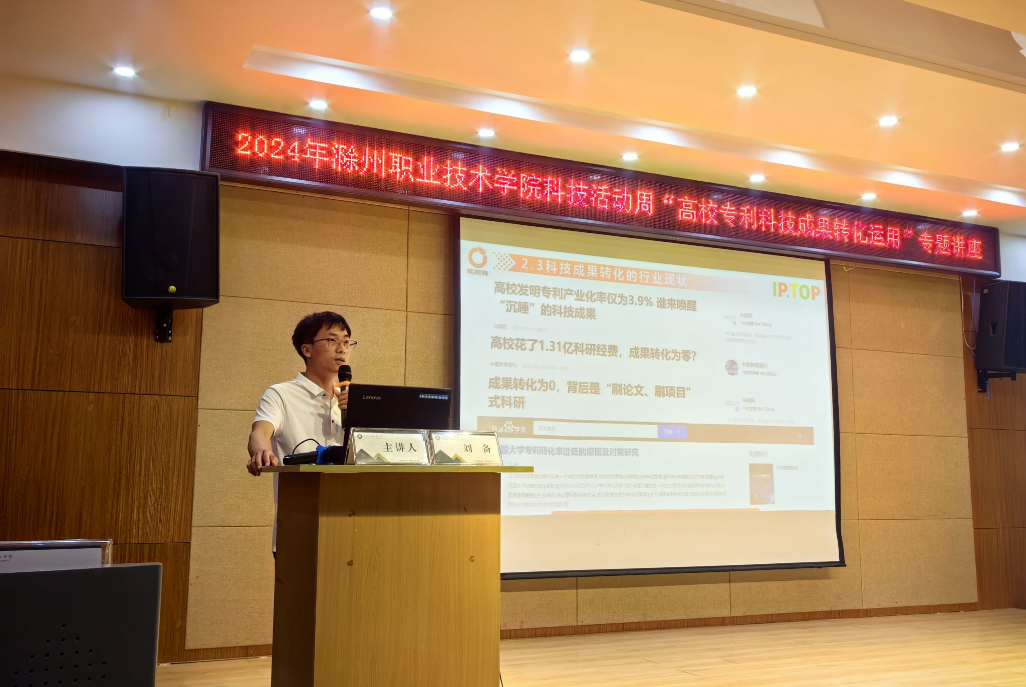 正值2024年科技活动周来临之际,为促进学校科技成果转化工作高质量发展,5月22日下午,科技处在南阶203报告厅举办“高校专利科技成果转化运用”专题讲座。此次讲座邀请到国家专利代理师、龙图腾网科技(合肥)股份有限公司联合创始人、北京专赢专利代理有限公司创始人刘备主讲,主要面向2024年度拟立项科研项目研究人员、校内现有存量专利发明人和近年入职的青年教师。科技处处长肖陆飞主持,来自各教学院部共百余名教师到场聆听。